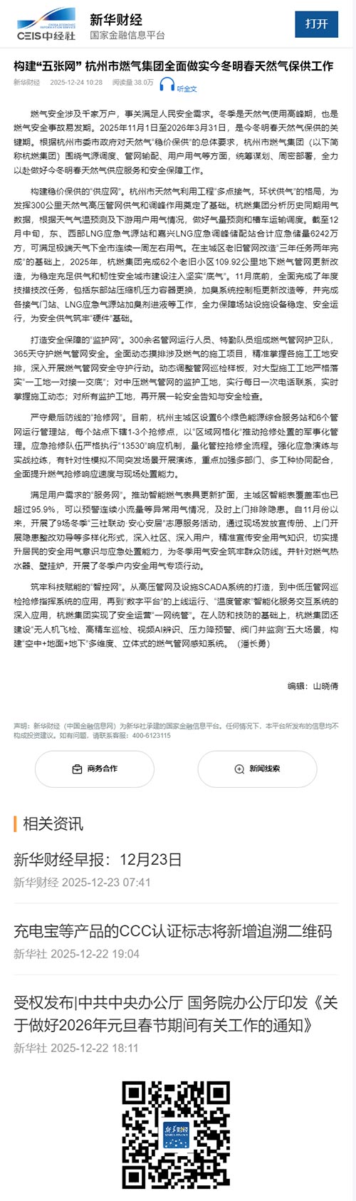 燃氣安全涉及千家萬戶,事關(guān)滿足人民安全需求。冬季是天然氣使用高峰期,也是燃氣安全事故易發(fā)期。2025年11月1日至2026年3月31日,是今冬明春天然氣保供的關(guān)鍵期。根據(jù)杭州市委市政府對天然氣“穩(wěn)價保供”的總體要求,杭州市燃氣集團(以下簡稱杭燃集團)圍繞氣源調(diào)度、管網(wǎng)輸配、用戶用氣等方面,統(tǒng)籌謀劃、周密部署,全力以赴做好今冬明春天然氣供應(yīng)服務(wù)和安全保障工作。