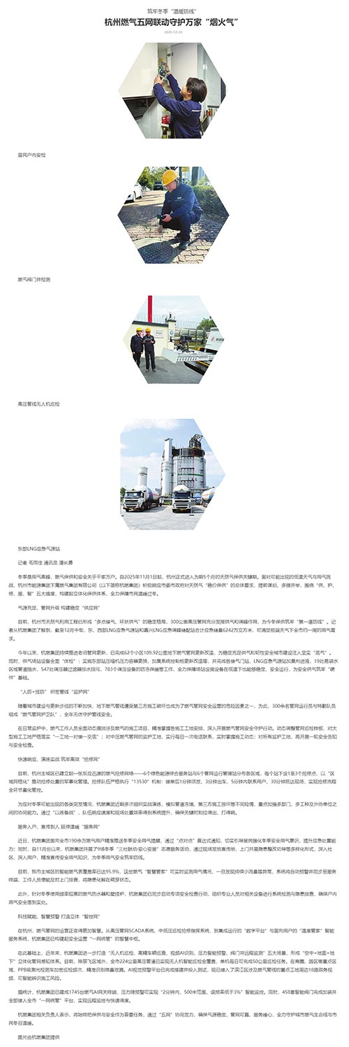 冬季是用氣高峰,燃?xì)獗9┖桶踩P(guān)乎千家萬戶。自2025年11月1日起,杭州正式進(jìn)入為期5個(gè)月的天然氣保供關(guān)鍵期。面對可能出現(xiàn)的低溫天氣與用氣挑戰(zhàn),杭州市能源集團(tuán)下屬燃?xì)饧瘓F(tuán)有限公司(以下簡稱杭燃集團(tuán))積極響應(yīng)市委市政府對天然氣“穩(wěn)價(jià)保供”的總體要求,提前謀劃、多措并舉,圍繞“供、護(hù)、修、服、智”五大維度,構(gòu)建起立體化保供體系,全力保障市民溫暖過冬。